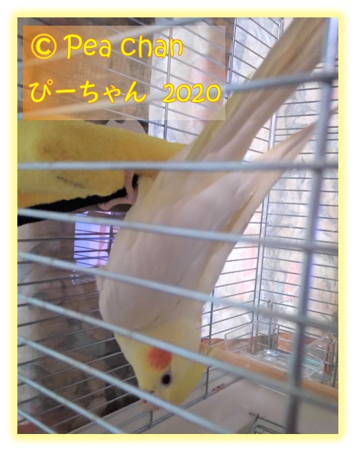 オカメインコのぴーちゃんは新しい止まり木にすっかり慣れて、時々ぶら下がるようになりました。こうしてぴーちゃんはこっそり特技を磨いているようです。